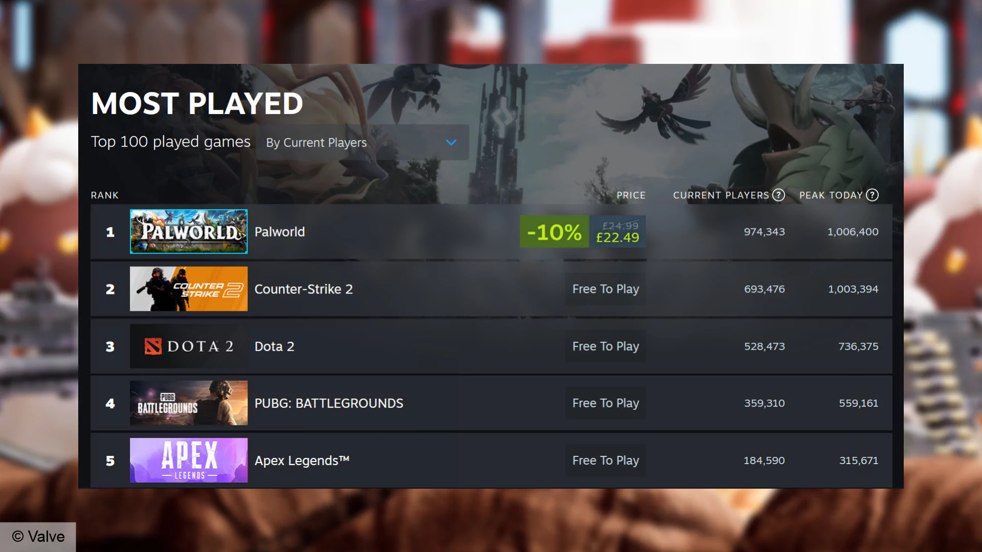 Palworld je na vrhu Steamove ljestvice najigranijih igara, pobijedivši Counter-Strike 2 sa vrhuncem od 1.006.400 istovremenih igrača. Ne samo to, Palworld je sada službeno nadmašio rekord Cyberpunka 2077, sa vrhunskim brojem igrača od 1.183.921 u vrijeme pisanja. To ga čini najigranijom plaćenom igrom ikad na Steamu po istovremenim korisnicima. Definitivno priličan podvig – i tko zna koliko još više može porasti? Jedine druge igre iznad toga su Dota 2, Lost Ark, Counter-Strike 2 i PUBG Battlegrounds, koje su sve dostupne kao besplatne igre.
